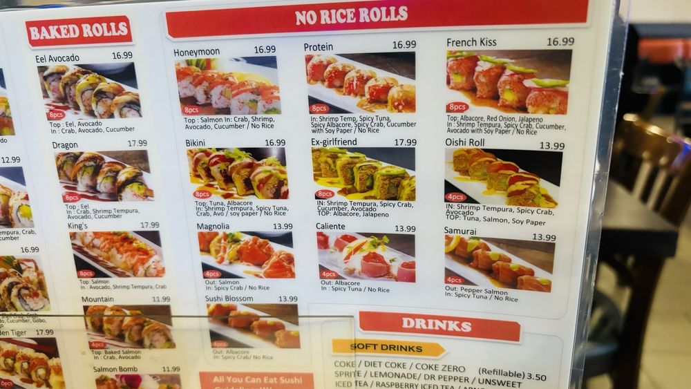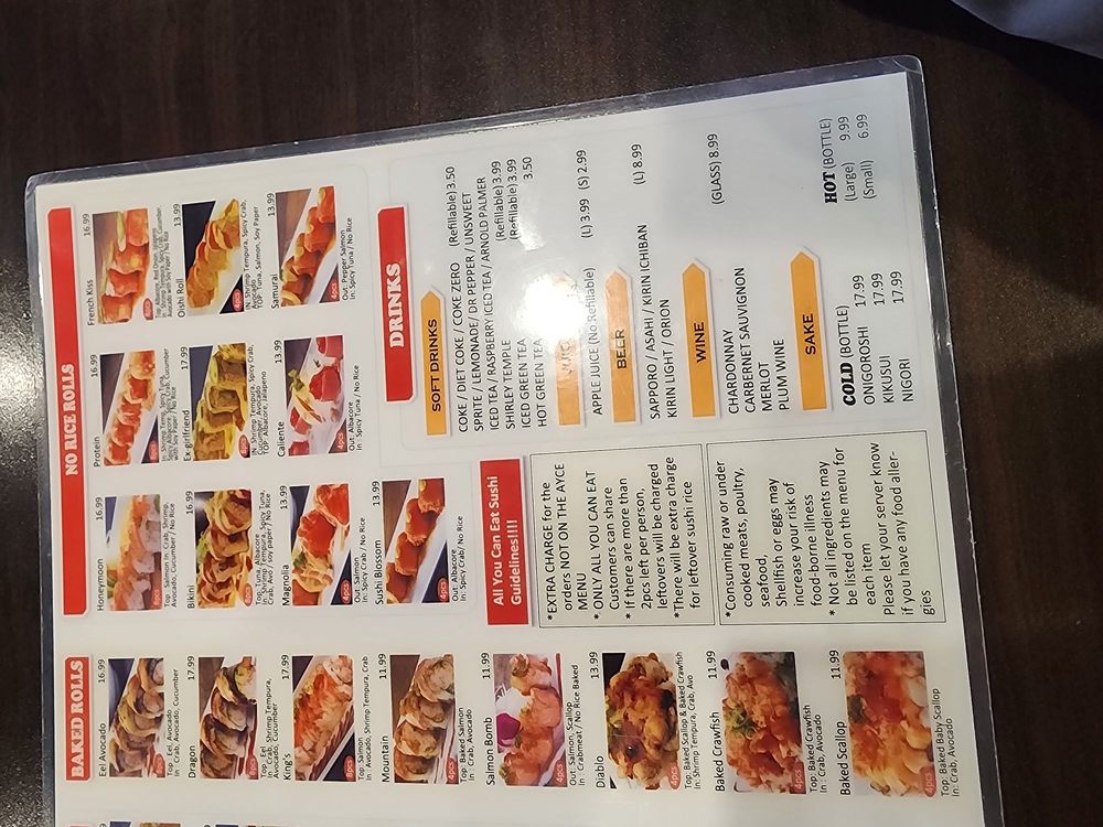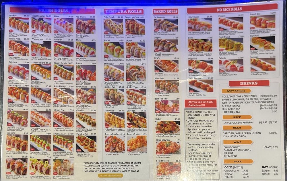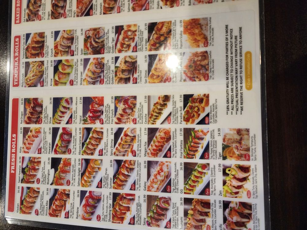 Top with tuna and avocado. In, shrimp tempura, spicy crab, avocado and cucumber.