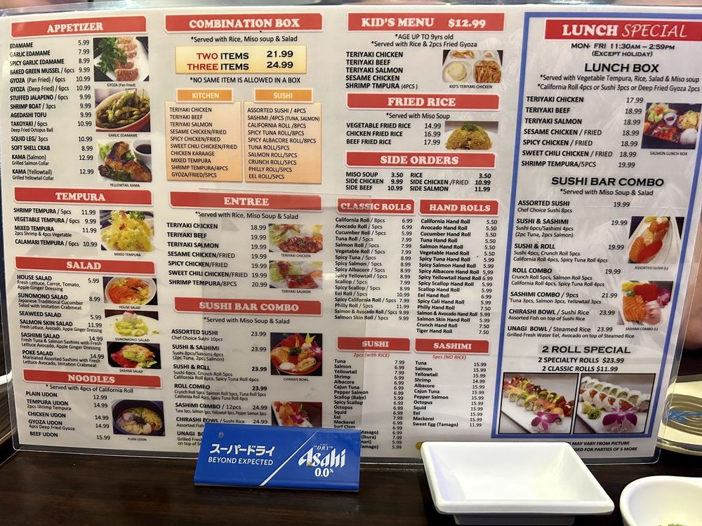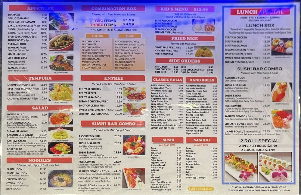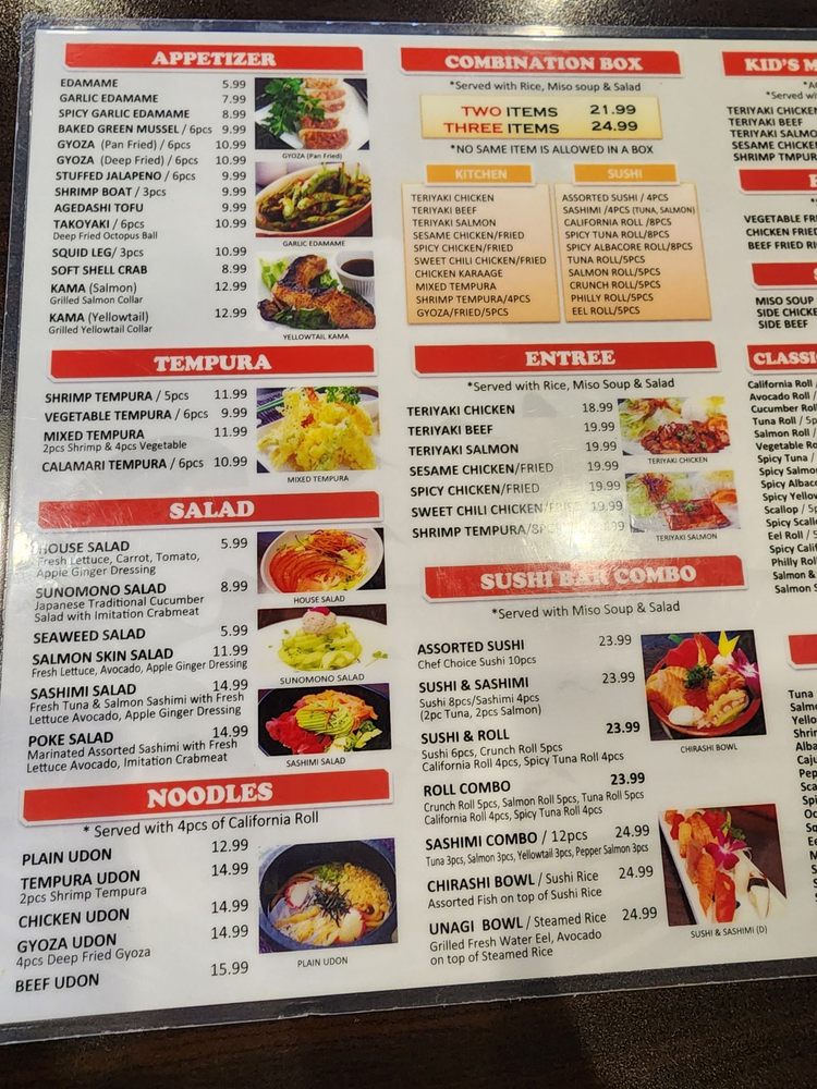 6 piece sushi, 5 piece crunch roll, 4 piece California roll and 4 piece spicy tuna. Served with salad and miso soup.