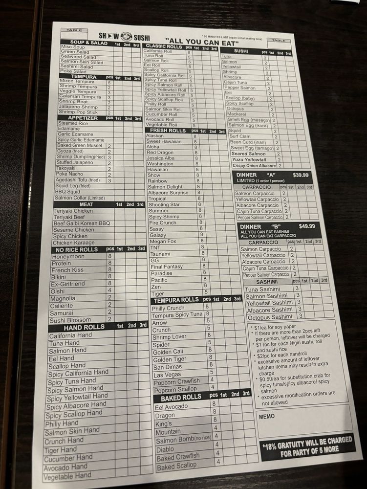 Show Sushi, located in San Dimas, CA, offers a casual dining experience with a wide range of menu options. From traditional Japanese salads like Snomono Salad to crispy Tempura dishes like Shrimp Tempura, the menu caters to various preferences. Customers rave about the AYCE sushi offering, with options like the Sweet Hawaiian Roll and specialty rolls that are flavorful and well-balanced. The modern and welcoming atmosphere, along with attentive staff, make dining at Show Sushi a delightful experience. Whether you're a fan of nigiri, rolls, or hot items, this spot has something for everyone. The high-quality ingredients and efficient service make it a go-to destination for sushi lovers. From fresh sushi to friendly staff, Show Sushi exceeds expectations and offers a memorable dining experience.